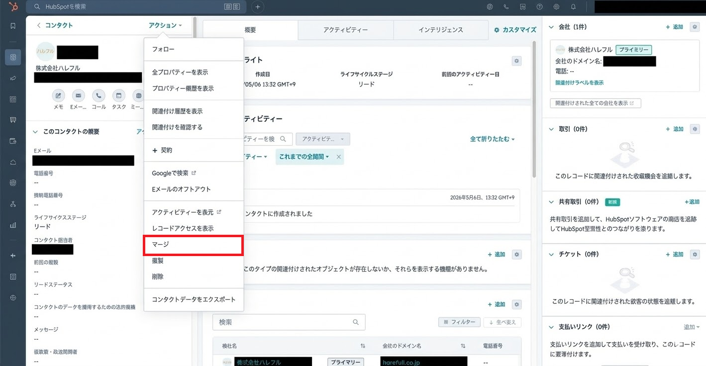 マージすると、2件のアクティビティ履歴や関連付けはすべて1つのレコードに統合されます。最初に開いたレコード(プライマリー)の情報が優先されるので、「正しいデータが入っている方」を先に開くのがポイントです。